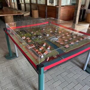 De maquette bij de entree voor de receptie in het voormalige koffiehuis met daarop niet alleen de huidige gebouwen, kamers en studio’s en tientallen (nog te bouwen) koop-(vakantie-)woningen aan het water achter de koffiefabriek, onderstreept de ontembare ambitie en groeiplannen van Peperpot. De eerste woningen aan de rivier achter het koffiehuis zijn al zichtbaar.